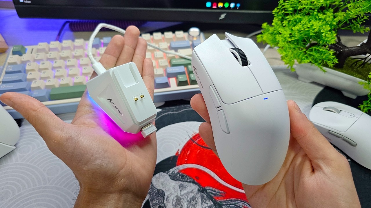 é bom você tá deixando ele perto para ter uma conexão mais estável e a conexão da base de carregamento é usbc É só colocar o usbc aqui e ela tem uma iluminação RGB bem interessante é algo legal né para saber que ela tá ligada e também para decorar um pouco o e eu gosto de deixar ele assim ó pertinho do mouse para poder tanto tá sendo fácil para botar ele para carregar quanto para ter né o melhor resultado quanto a conectividade porque aqui ó fica o dangle e fica muito mais simples de você não tá