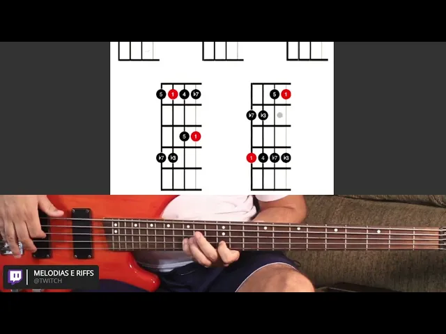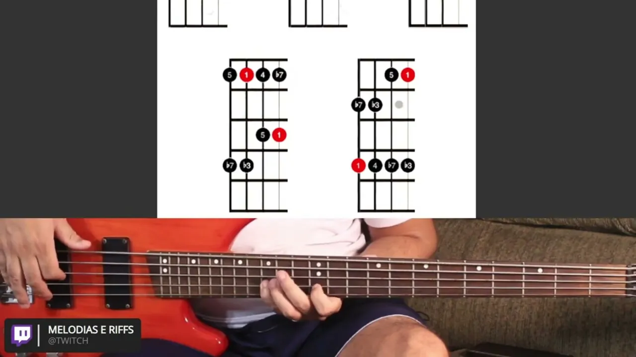 na terceira corda de baixo para cima com o dedo [Risadas] e por último o quinto modelo que a gente vai ter na escala pentatônica menor que vai estar na quarta corda de baixo para cima começando com o dedinho e vai ficar assim [Risadas] Então esse aqui são cinco modelos da escala pentatônica menor Lembrando que você precisa treinar em todas as outras tonalidades também é só prestar atenção sempre aqui ó aonde tá o pontinho vermelho que ele vai estar indicando quem é fundamental do acorde que você tá tocando então se você for fazer a escala por