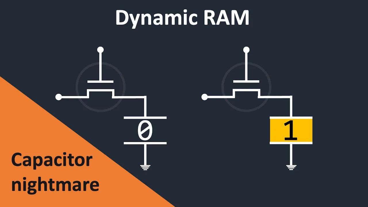perfect Dynamic Ram has several disadvantages consider a scenario where a dynamic memory cell is storing a one meaning the capacitor is fully charged to read the value stored in the cell our only option is to open the gate to check if electricity flows from the capacitor this means that in dynamic memory reading data is a self-destructive operation because checking whether a capacitor holds a charge involves discharging it and this is where things start to become very complicated when implementing dynamic memory for the rest of this video we're going to explore how the reliability issues of
