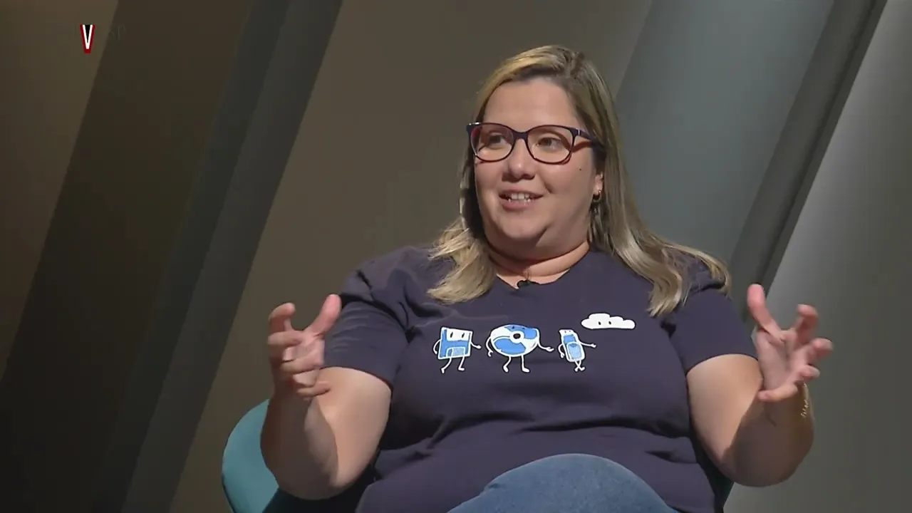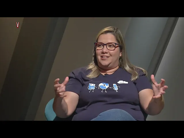 entender se eles estão entendendo Qual é o desafio a gente já tá fazendo um processo de decomposição porque a gente tem que entender o que que nós vamos resolver aqui Luciene Mara de Lima Professora Branca tem cabelos loiros e lisos na altura dos ombros usa óculos de grau de armação roxa ceta azul escura com estampa de três personagens humanoides e uma nuvem calça jeans e tênis branco entre as três mulheres duas pequenas mesas redondas de vidro com copos d'água tá começaram a criar estratégias começaram a a a pensar em hipóteses Só que nesse percurso como