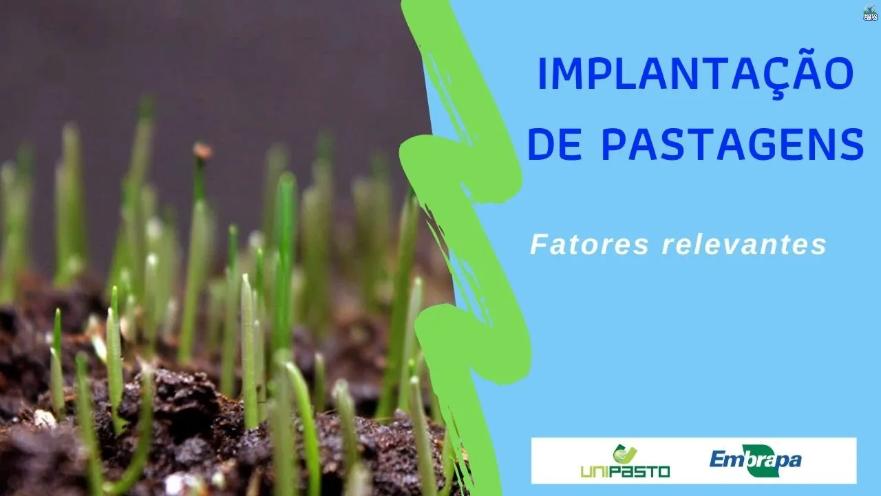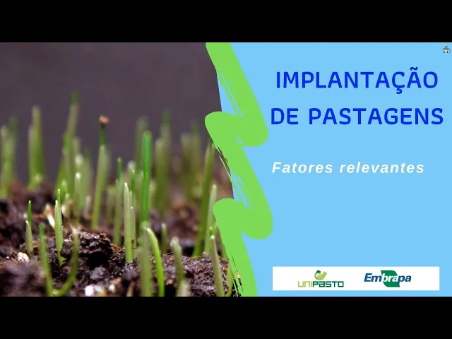 e [Música] a implantação da pastagem ao processo de semeadura de implantação na verdade da incorporação das sementes para ter um bom estabelecimento da pastagem para que se tenha uma boa cobertura do solo e produção animal diversos itens devem ser considerados na implantação da pastagem no sentido de um ter uma boa formação da mesma o primeiro deles a escolha da forrageira importante que ela seja adaptada aos solos da propriedade e renda aos sistemas de produção proposto nós temos pastagens para solos mais pobres solos mais férteis e também para diferentes sistemas de criação animal muito importante trabalhar