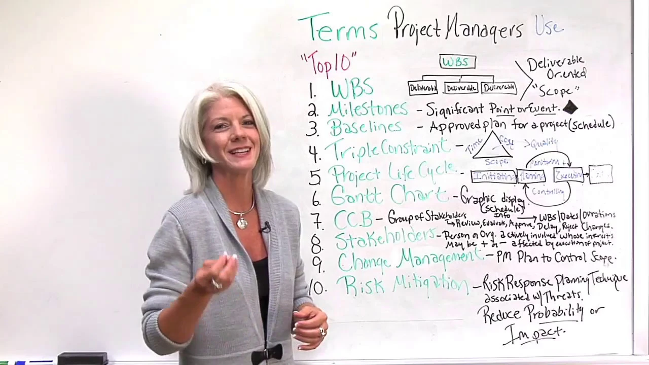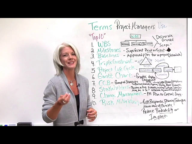 hello I'm Jennifer wit director of project manager.com [Music] well Welcome to our whiteboard session today on terms that project managers used today I'm going to talk about my top 10 and hopefully they'll be helpful I want to point you to a resource that I think is very helpful um this is the guide to project management body knowledge by PMI the project management Institute there are other resources out there you can certainly Google some of these terms too but it's important coming into project management whether you're new to project management coming in or maybe you're on