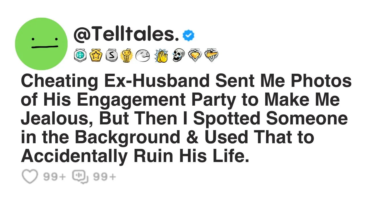cheating ex-husband sent me photos of his engagement party to make me jealous but then I spotted someone in the background and used it to accidentally ruin his life about a year ago my ex-husband Sam 32 M decided to leave me 30f for his younger cooworker who he had been having an affair with for almost 8 months at the time we had been together for 4 years and married for two we were just a week away from celebrating our second marriage anniversary when he told me that he couldn't do this anymore and that he had been