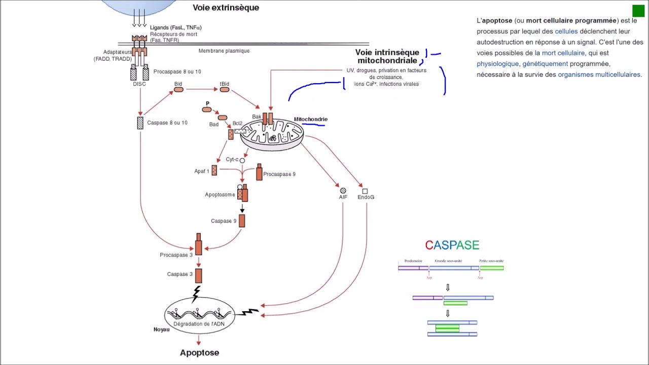 l'apoptose c'est le point d'org d'une cascade de phénomène moléculaires on va distinguer quatre étapes il y a les signaux extérieurs qui indiquent à la cellule qu'il faut qu'elle se mette en apoptose l'intégration de cette information à l'intérieur de la cellule et des changements intracellulaires qui aboutissent à l'apoptose elle-même c'estàdire la phase d'exécution et enfin la disparition de la cellule apoptotique les signaux qui indiquent à la cellule qu'elle doit se mettre en apoptose sont des signaux extérieur il peut s'agir de signaux chimiques qui vont pénétrer directement à intérieur de la cellule par exemple la présence d'oxydant