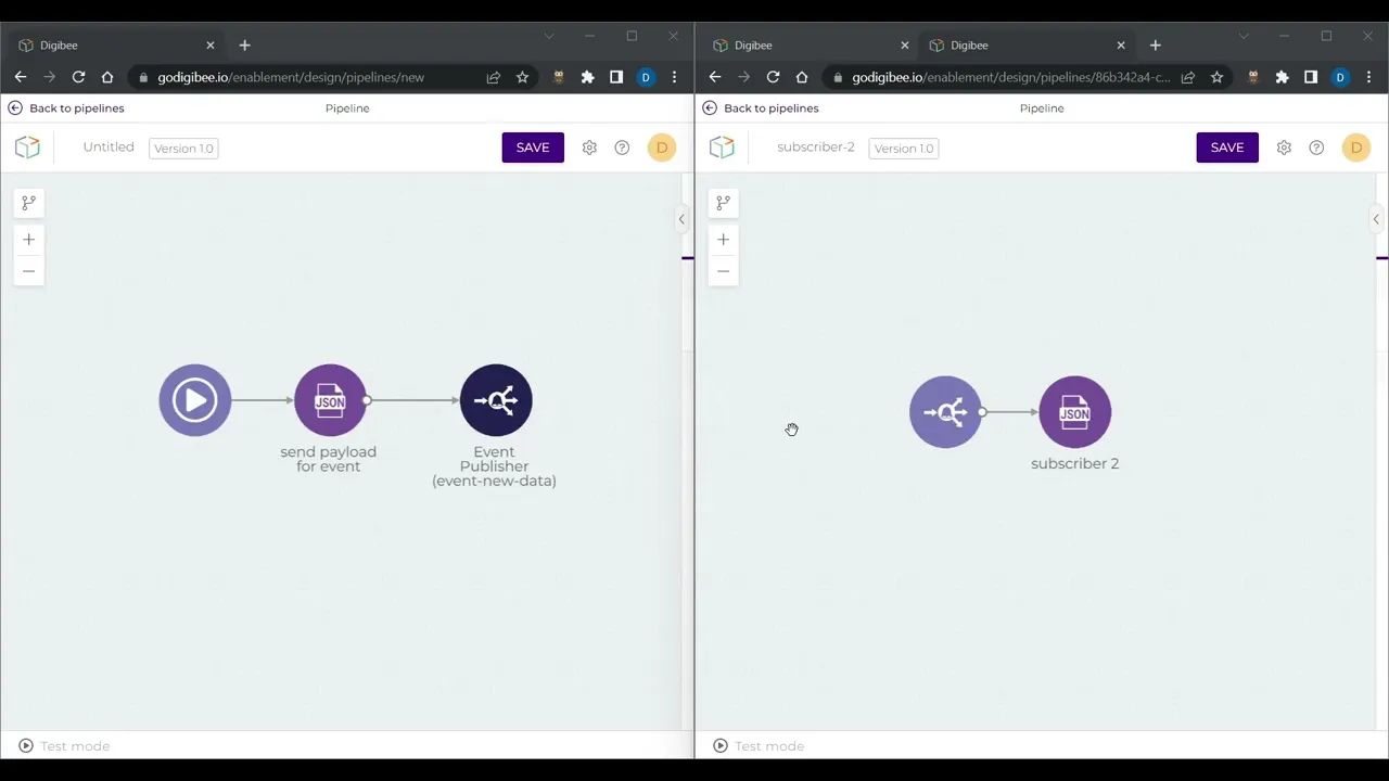 olha só temos aqui esse esse pipeline ouvindo ao event New data ele vai pegar as informações entreg por esse pipeline e vai passar por esse diator aqui o eu coloquei exemplo um e coloquei a mensagem que ele está recebendo dentro de um atributo chamado received message assim a gente vai poder olhar diretamente na aba de monitoramento que está acontecendo já pro caso do subscriber 2 Temos algo muito parecido o Trigger dele é o mesmo ele possui um Trigger event escutando exatamente o mesmo evento e aqui também temos um de nerei T falando que agora é