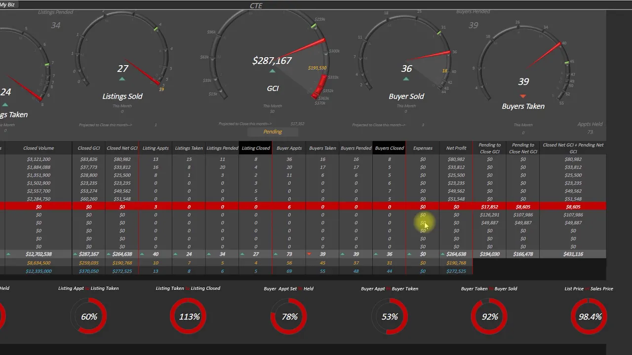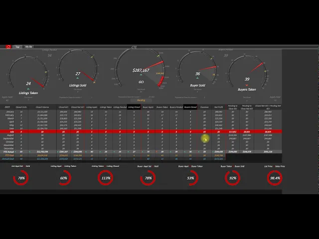 I'll show you some charts here as well and then the key areas of my business are gauged out right in the middle and then I can see details of each month what did I do in every section of my business very important to be able to see these key indicators so do your closed units volume GCI your net GCI after paying out all of your splits and cost of sales your appointments that you've gone on for listing so this is a key indicator of future business and making sure that this is staying up if this
