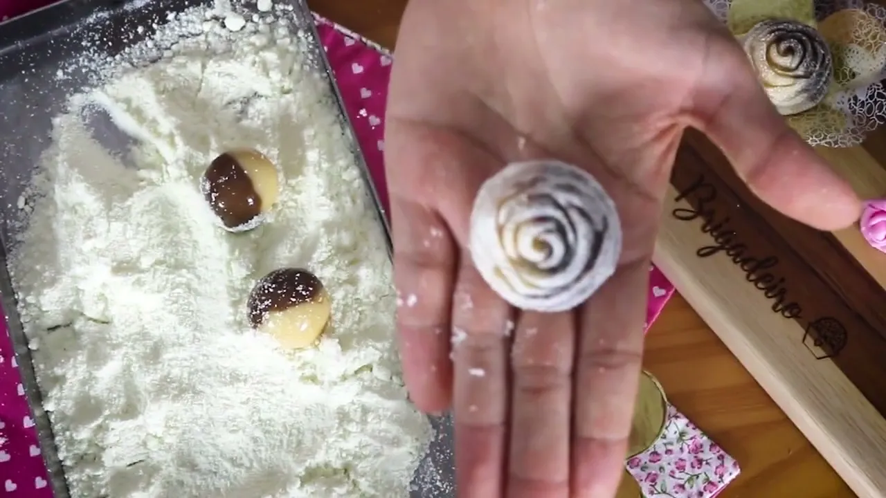 brigadeiro gourmet com a marca no ponto certinho o ponto de enrolar bem perfeitinho porque se você faz um brigadeiro gourmet uma receita que não te dá um ponto como esse a sua florzinha seu brigadeiro vai ficar ali dentro ele não vai conseguir sair e então acho que eu peguei importante que você tem uma massa perfeita com a técnica perfeita que aí ó você vai pegar que a sua bolinha vai colocar no molde você vai preste olhar para poder fazer o formato certinho da florzinha depois você vai virar e vai desenformar dando elas apertadinho e olha