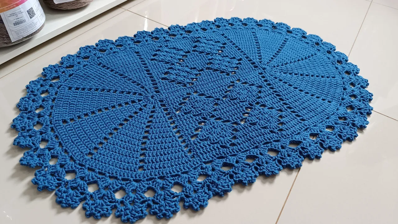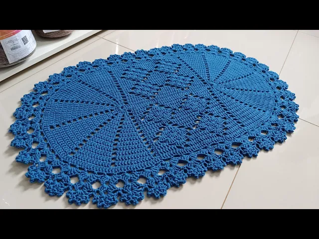 ó pessoal fiz ele ele aqui no tom de azul royal E olha que gracinha que ficou pessoal Gostei bastante desse daqui tá gostei mais dessa cor aqui Dá para vocês ver o bico De acabamento direitinho fica um tapete retinho pessoal eu super Amei Olha isso deixa eu mostrar aqui o desenho do centro para vocês tá e eu espero muito que vocês gostem se vocês gostar desse trabalho pessoal compartilha esse vídeo se inscreva no nosso canal compartilhe nos grupos aí de crochê que vocês faz parte que vai me ajudar por demais tá bom eu fui todo