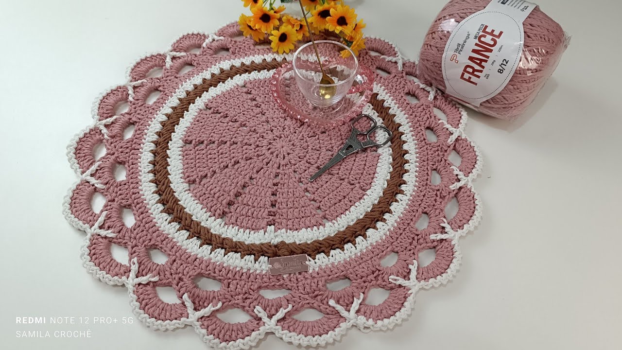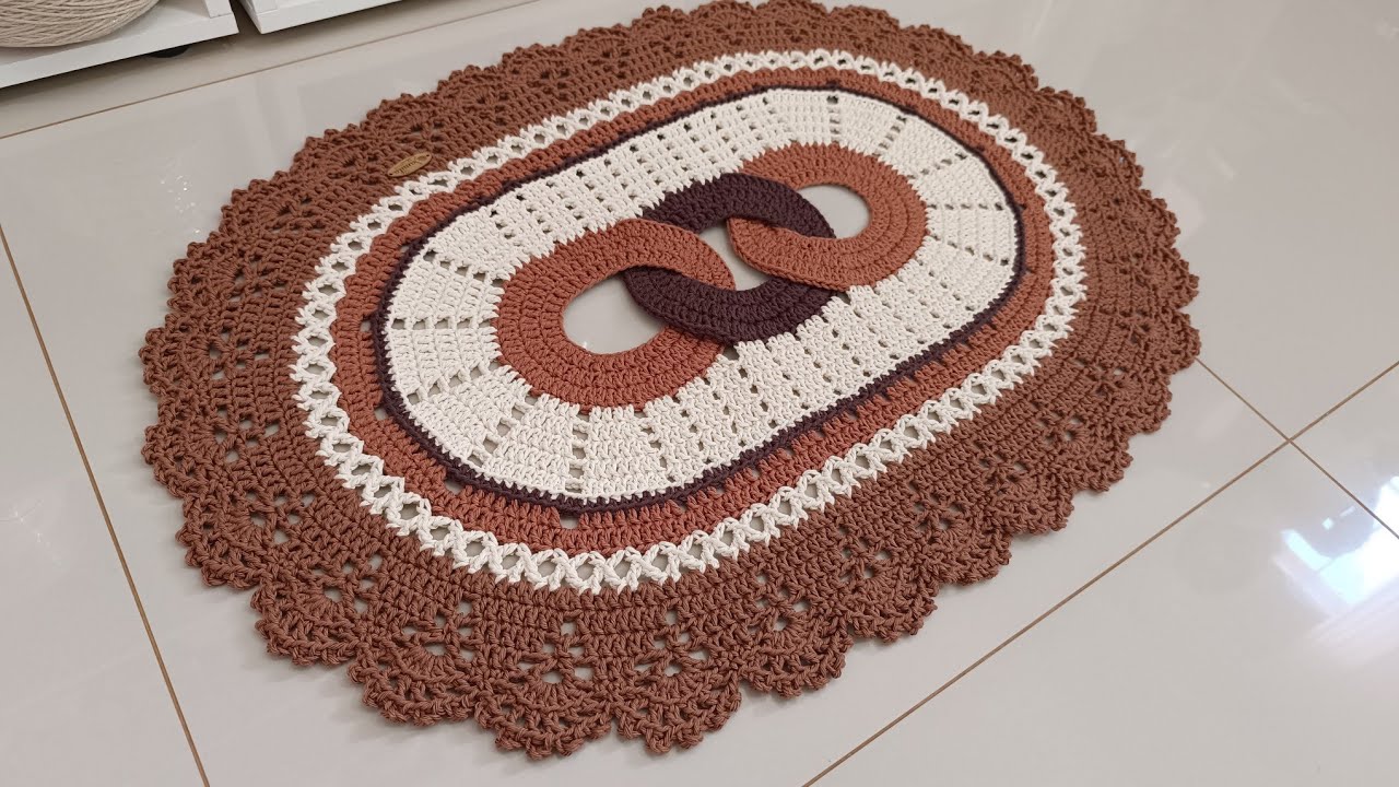 oval a única coisa que vocês tem que observar é se precisa dar correntinha ó como vocês estão vendo o meu tá certinho eu vou terminar o meu aqui e já volto pronto pessoal fiz todo o acab E olha que lindo que ficou chegando aqui fiz duas correntes eu venho aqui pessoal ó finalizo com um ponto baixíssimo uma Corrente Já cortei o fio agora vou mostrar o resultado desse lindão para vocês vamos lá ver Prontinho pessoal tapetinho finalizado por aqui eu espero muito que vocês tenham gostado e se gostou demais desse modelinho se inscreva no nosso