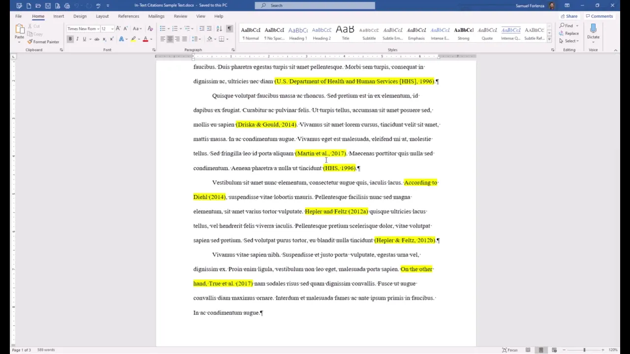 particular use the timestamps to get there I am demonstrating everything in this video using Microsoft Word on a Windows computer if you are using a different word processing program or using word for Mac the citations will still look the same in order to get the most use out of this video though I recommend pausing and rewinding as needed is a couple of other quick notes I am using lorem ipsum text or placeholder text for illustrative purposes the in-text citations are highlighted to make them easier for you to see I also have formatting symbols displayed because
