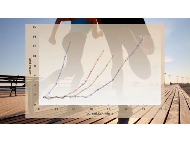 são as adaptações que nós esperamos em nessas eh diferentes intensidades ou seja o sistema de determinação de limiares ele serve como um mapa um mapa de prescrição de Treinamento e é bastante útil numa série de situações pois bem eh todos apresentam o mesmo padrão de resposta de lactaid demia a resposta é não vejam esses gráficos aqui apresentamos quatro gráficos que apresentam morfologia muito semelhante mas notem que esse indivíduo aqui apresenta um consumo máximo de oxigênio da ordem de 60 este da ordem de 40 e este da ordem de 35 e esse da ordem de 17