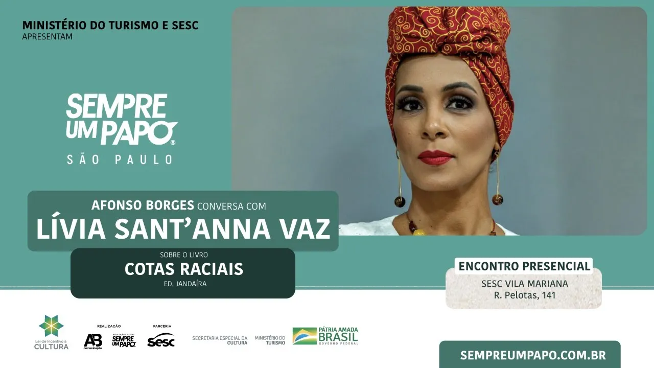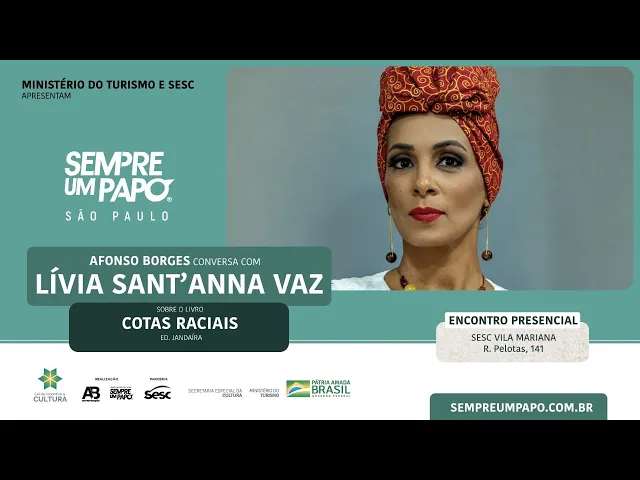 Sejam todos bem-vindos bem-vindos e bem-vindos ao auditório do Sesc Vila Mariana para essa edição do sempre um papo com Lívia Santana e mediação de Afonso Borges a conversa de hoje tem o tema cota não é esmola seguida do lançamento do livro cotas raciais Os encontros do sempre um papo são gravados e postados no canal do YouTube do projeto a presença no teatro autoriza o uso das imagens e posterior de fusão Lívia Santana nasceu em Salvador na Bahia é promotora de justiça e Doutora em direitos e Estudos jurídicos pela Universidade de Lisboa é mestre em Direito