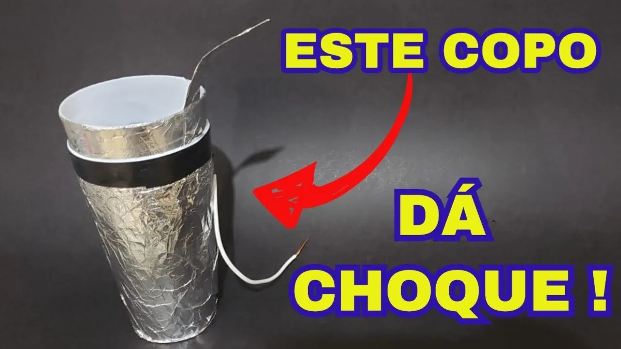 é o que a gente vai fazer hoje nós vamos fazer um copo que dá choque ele não precisa ligar na tomada e não usa pilha muito menos bateria Eita Então vamos fazer mas antes de começar deixa lá então se inscreve no canal e Ative o Sininho para fazer esse copo que dá choque a gente vai precisar de dois copos Você vai precisar de dois copos que sejam iguais e que o encaixe dentro do outro dessa forma a gente vai embrulhar esse copo em papel alumínio vamos colar um durex nessa pontinha aqui vou me enrolar o