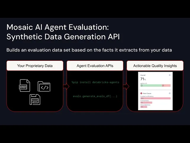 hi folks welcome back to data Brooks I'm Eric Peter the PM for agent evaluation and framework we are excited to announce agent evaluations new synthetic data capabilities available today we've designed this capability to help developers improve the quality of their AI agents specifically this product addresses a key challenge that we've heard from many customers it's a difficult and timeconsuming process to have subject matter experts label high quality evaluation data however without this data it's difficult to evaluate and improve agent quality to reach production quality targets our synthetic data API allows developers to overcome these challenges