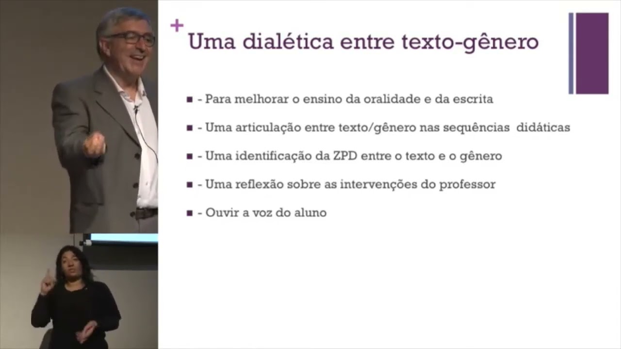 e vocêes vão ver que vou falar de gestos de gestos que nós observamos nos professores e e as nossas as práticas Ordinárias dos professores nos ajudam a identificar eh as intervenções as ações concretas dos professores que são mais produtivas e que nós podemos comparar entre diferentes aulas eh eh Por que nós trabalhamos sobre géneros porque em todas as línguas a diversidade de textos é muito grande e quando eh a gente fala de um texto eh vai falar de eh um artículo para apresentar um tema do saber um conto uma leenda e na sociedade identificamos os