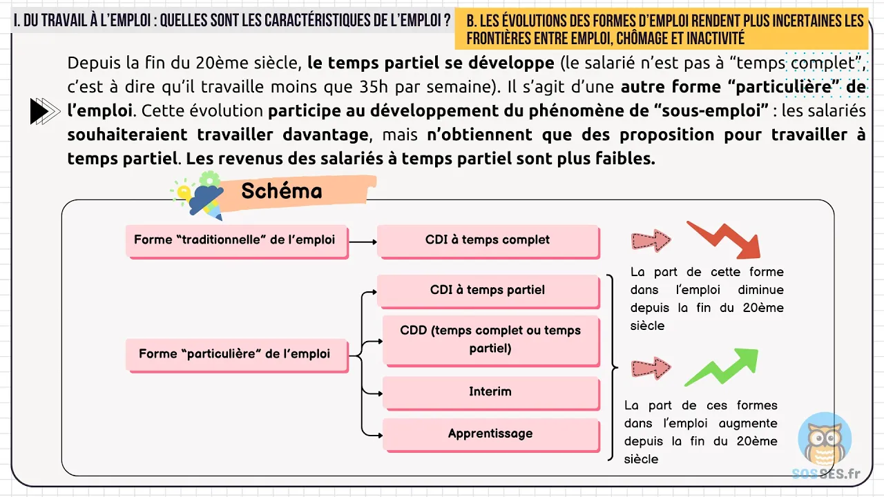 souhaiterais travailler plus et bien forcément tu as des revenus qui sont plus faibles puisque tu travailles moins d'heur donc pour résumer je te propose ce petit schéma on voit que les formes ce qu'on appelle les formes traditionnelles de l'emploi ce sont les CDI à temps complet ces CDI à temps complet sont de moins en moins présent sur le marché du travail ça reste la forme normale entre guillemets mais comme on l'a évoqué tout à l'heure cette part diminue à l'inverse il y a un fort développement de ce qu'on appelle les formes particulières de l'emploi les