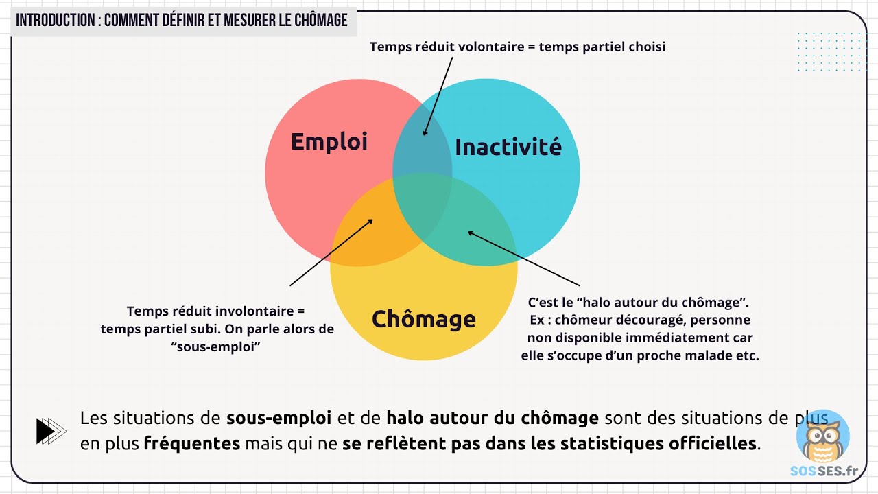 emploi par exemple parce qu'ils doivent s'occuper d'un proche malade ou parce que éventuellement eux-mêmes sont malades donc ces individus ne rentrent pas dans les critères du chômage mais ils s'en rapprochent pour conclure les évolutions des formes d'emploi rendent les frontière entre emploi chômage et inactivité moins clair certaines personnes se retrouvent dans des situations qui sont ambigu par exemple sous-emploi où elles ne sont ni complètement au chômage ni pleinement en emploi et il y en a aussi certains qui alterne très rapidement entre ces situations à cause des particularités des contrats comme le CDD ou comme l'intérim