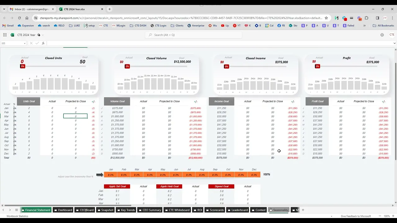 all right once you have your actual goals entered in here one thing that's very important is to adjust your seasonality to fit your market and fit what you guys want to do for the year so on this seasonality tab we've made some major updates for 2024 so you get to control your seasonality right up top here we just have some default numbers in there um make sure that it totals 100% but you get that your closed seasonality what you want to do each month you guys can control so as you change this let's say I