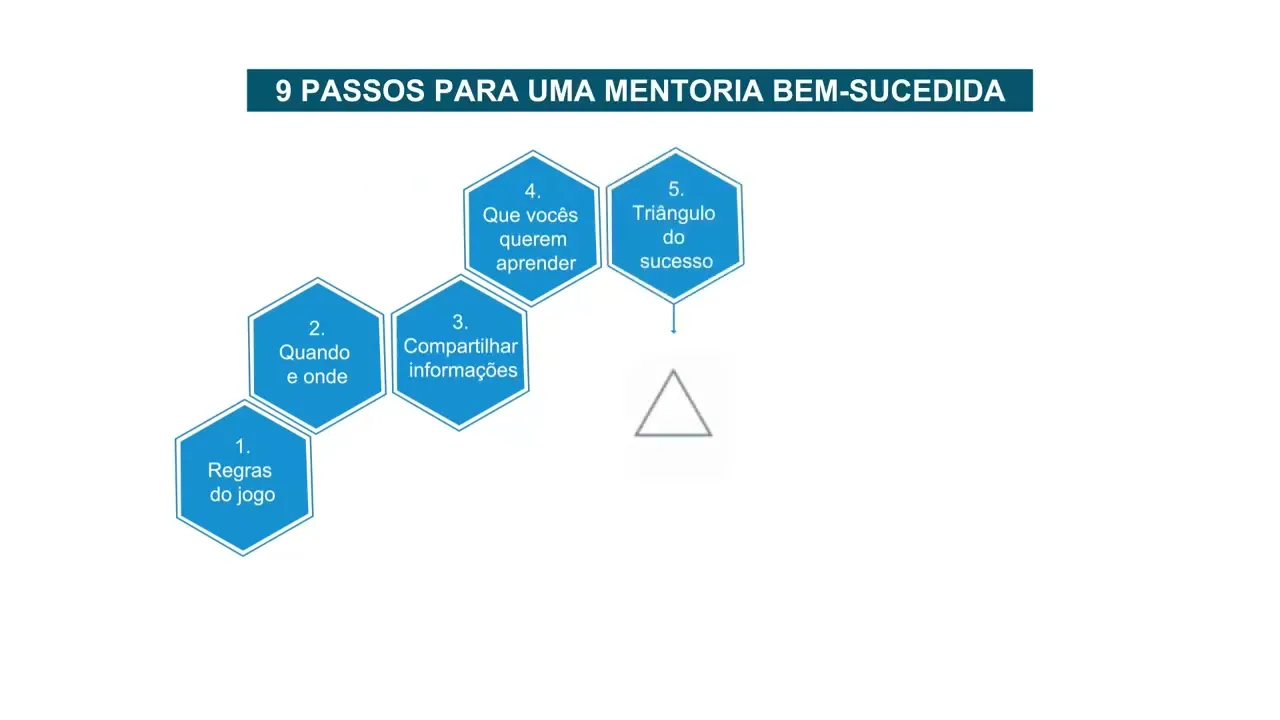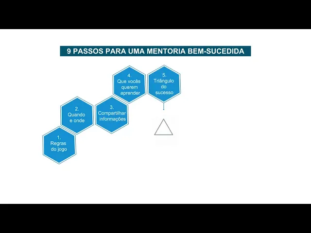 bem-sucedida são os seguintes primeiro chegar a um acordo sobre as regras do jogo inclusive sobre como a confidencialidade será tratada como segundo passo é ideal discutir quando e onde se encontrar recomenda-se realizar pelo menos três reuniões presenciais e se necessário reuniões virtuais terceiro compartilhar informações inclusive os resultados de testes de personalidade ou de habilidades como uma avaliação 360 como quarto passo é importante considerar o que vocês querem aprender e em quais áreas desejam crescer o quinto passo é o chamado Triângulo do Sucesso que inclui aprender a construir relacionamentos navegar na organização e desenvolver habilidades técnicas