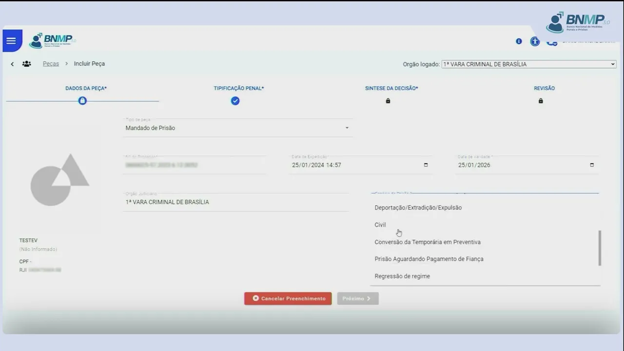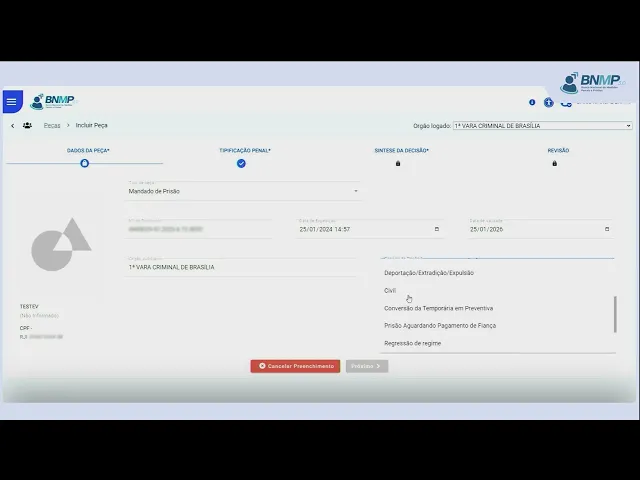 [Música] para localizar o cadastro da pessoa em pessoas cadastradas Clique na opção ver todas no campo pesquisar digite o nome da pessoa ou outro dado conhecido e Clique na lupa identificar a pessoa clique no menu localizado no canto direito da tela e selecione a opção incluir peça em tipo de peça selecione mandado de prisão informe o número do processo a data de validade da ordem a espécie de prisão o tipo de sigilo o local da ocorrência caso conhecido e o prazo da prisão por fim clique em próximo Lance a síntese da decisão clique no teor