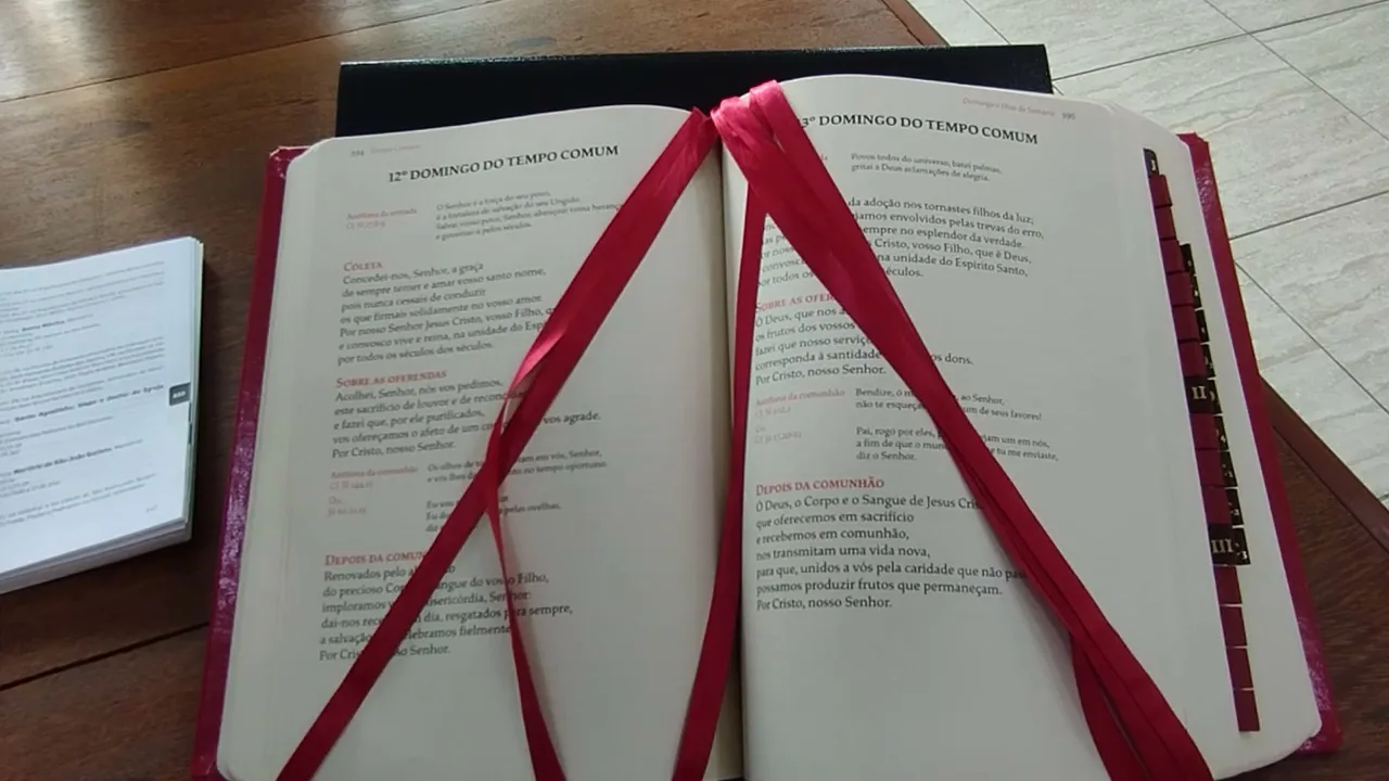 as fitas ele conseguia ainda manusear o Missal pro padre apontar Aonde tá cada momento de acordo com a etapa de acordo com a a parte da celebração pois bem outra coisa também é que claro o algumas paróquias os padres já trocaram essas fitas por outras coloridas né E talvez na sua Paróquia seja assim isso também pode te ajudar um pouco porque vai ter Então as fitas coloridas novamente mas muito bem então vamos começar a marcar aqui o Missal Romano na prática para vocês verem como que é é é feito né do mesmo modo vamos marcar