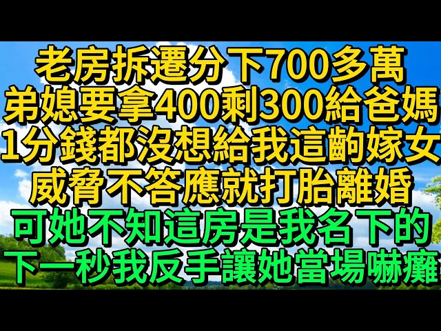 老房拆遷分下700多萬,弟媳要拿400剩300給爸媽,1分錢都沒想給我這齣嫁女,威脅不答應就打胎離婚,可她不知這房是我名下的,下一秒我反手讓她當場嚇癱 | 柳梦微语