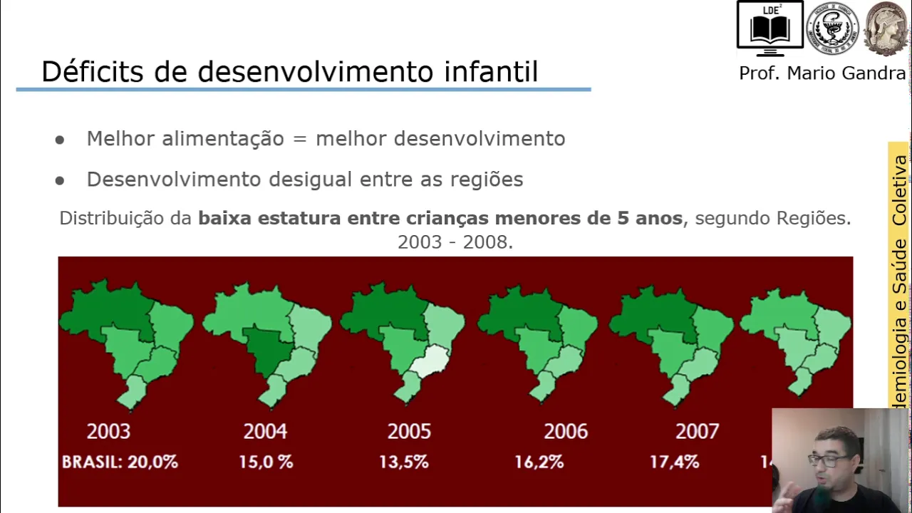 era maior nos Estados nas regiões nordeste norte e caindo mais acentuadamente e elas agora estando muito mais próximo das outras regiões Mas o mais importante é a gente vê como foi muito grande a queda né e a gente reduzir a desnutrição infantil a percentagem muito baixo né gente ainda tem algumas coisas para conquistar mas a gente já conquistou bastante porque disso porque você tem mais acesso à alimentação de qualidade você tem mais campanha para o aleitamento materno é melhor distribuição de renda É melhor por ele cultura Então você com isso tem um melhor Desenvolvimento Infantil