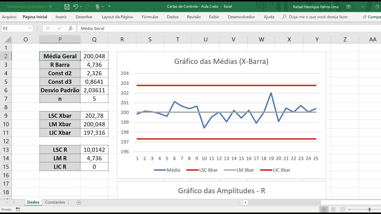maior valor aqui seria 300,4 e o menor valor o 297,6 então a amplitude seria a diferença desses dois valores o maior - o menor que dá 2,8 e aí a gente faz o mesmo para todas as demais amostras aí aqui nós temos os valores para poder começar a calcular os limites de controle do processo antes a gente próximos slides gostaria de mostrar pra vocês que o gráfico x barra r na verdade é composto por dois gráficos a gente tem o gráfico x barra e o gráfico r ou seja o gráfico das médias que o x