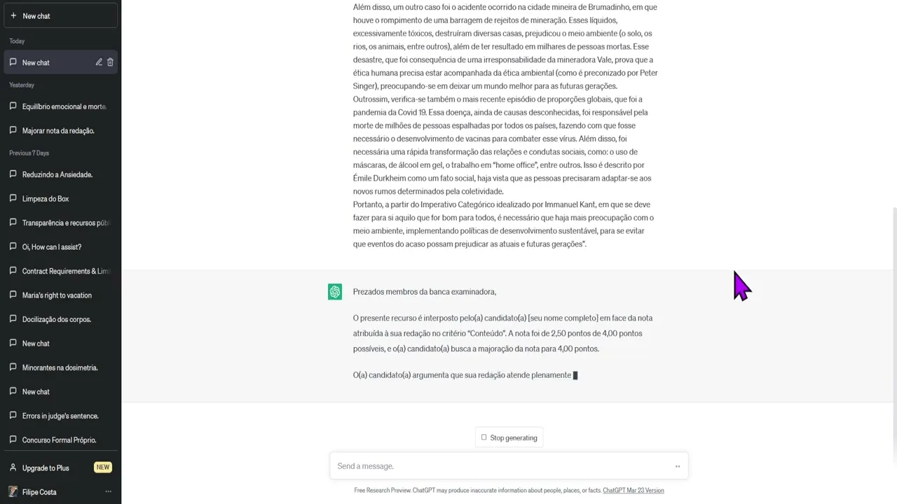 entendeu então algumas coisinhas vocês vão adaptando tá o candidato argumenta que sua redação atende não não precisa colocar isso coloca assim a relação atende plenamente aos requisitos propostos enunciado da prova em primeiro lugar a perspectiva adotada no tratamento do tema foi Clara e coerente tal tal E aí Vocês entenderam vocês vão adaptando né aqui o chat PT vai te dar um recurso assim assim algumas coisas dá para se aproveitar outras não e aí Cabe a você fazer essas adaptações de acordo com as regras né que são colocadas no edital aí do seu concurso público Beleza