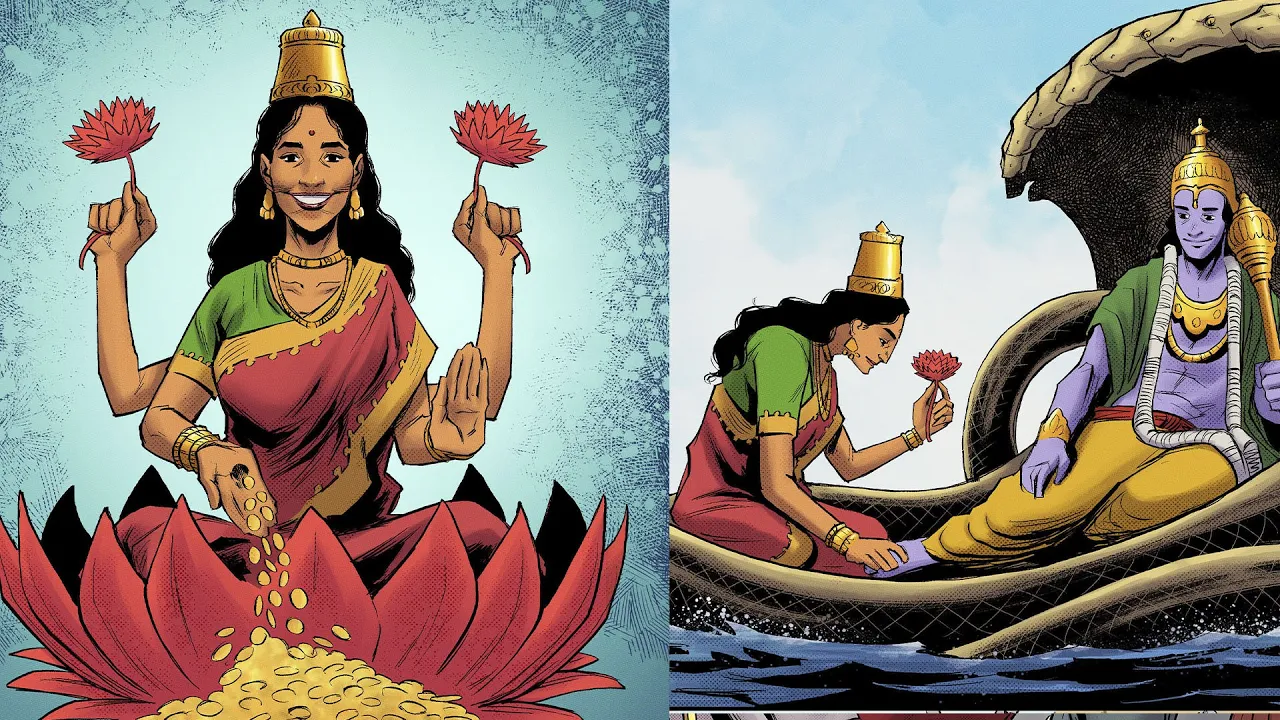 overflowing with gold symbolizing Purity and prosperity sitting or standing on a lotus flower she is often joined by elephants which symb symbolize abundance and fertility Lakshmi is vishnu's consort one of the main deities of Hinduism known as the protector of the universe together they are revered as the Divine couple and represent the ideal of a harmonious and balanced partnership the goddess is often depicted sitting at vishnu's feet or resting on his chest epitomizing their deep bond and eternal companionship the goddess is worshiped in multiple forms and manifestations and different Indian regions and other parts of
