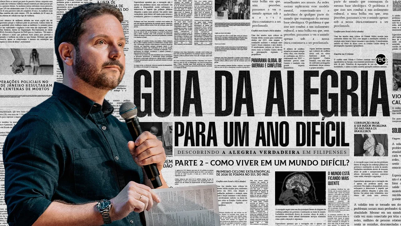 เฮ Bom dia. >> Bom dia. >> Que alegria ver você aqui, ver essa igreja cheia. Hoje nós estamos aqui para continuar a nossa série de mensagens. chamada Guia da Alegria para um ano difícil. Eu sei que talvez você tenha ouvido no Instagram promessas, promessas vazias de um ano fácil, de vitória, de conquista, mas a verdade não é essa. Em 2026, a vida real continua. Ainda mais boletos, ainda mais impostos, ainda mais inflação, ainda mais medo, ansiedade, ainda mais tensão política, ainda mais polarização, ainda mais discussão, ainda mais distanciamento nos relacionament Prepare-se. É por isso que