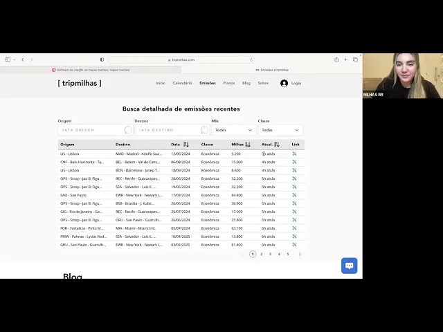 Oi meu nome é ivanise e hoje eu troue mais um buscador com milhas para você fazer as suas buscas já começando a apresentar o nome desse buscador é Trip milhas nessa página inicial a gente consegue visualizar alguns cards tá com oportunidades recentes do dia vou procurar aqui um c bem legal tá tem vários aqui pronto Vitória para Aracaju no dia 2/08 por 14. 200 milhas o trecho você pode apertar aqui em conferir que vai levar que vai te levar diretamente pro programa Fidelidade tá e o programa fidelidade tá descrito aqui em cima ó programa sorrisos já te deu uma dica Qual é o programa sorrisos é o programa Fidelidade da Smiles é sorrisos em inglês então aí você pode verificar mais cards nessa página inicial agora migrando aqui de página Vamos para essa página de emissões carregando aqui Prontinho nessa página de emissões visivelmente temos uma tabela detalhada com as melhores oportunidades de emissões com milhas eh E você também consegue filtrar trechos de origem trechos de destino a data né aqui com o mês ó Janeiro Fevereiro Março Abril Maio a classe com as cabines tanto em econômica e executiva Aqui também tá descrevendo origem destino data classe com milhas né que eu já disse e um outro detalhe que mostra a disponibilidade de forma recente Ou seja que 7 horas atrás é clica aqui 3 horas atrás ou três dias atrás claro que a gente vai sempre buscar as emissões mais recentes aqui tá 3 horas atrás porque eu simplesmente tô gravando 5:30 quase 5:40 da manhã mas geralmente durante o dia essa informação fica uma hora atrás porque sempre vai atualizando a cada hora ou seja a informação aqui ela tá em buffer né que é 3 horas atrás 4 horas atrás 5 horas atrás então há 3 horas atrás que aqui é a mais recente a gente teve a emissão aqui de Lisboa para para Madrid eh ainda nesse mês 12/06 2024 econômica por 5200 milhas o trecho isso é missão dentro da Europa dentro do Brasil mais pegando aqui mais um exemplo a gente tem aqui Belo Horizonte para Belém no dia 6/08 agosto né Econômica obviamente por 15. 000 milhas o trecho isso saiu há 4 horas atrás um dos exemplos Você pode você vai ter que ter uma tabela que ela vai até o valor em executiva Tá bom você também pode filtrar aqui não esqueça disso vamos agora para a página do calendário nessa página do calendário dos voos sorrisos da Smiles a gente consegue aqui e fazer uma pesquisa bem específica no meu caso vou usar aqui um exemplo São Paulo tô usando aqui o código IATA para facilitar para Joanesburgo código I da Joanesburgo é jnb tá aqui mostra os trechos eu vou escolher aqui somente ida para facilitar né aqui a busca a classe eu quero em econômica e a data vou botar em agosto tá não sou um robô clicar aqui também não sou um robô né pessoal e vamos buscar esses sorrisos aí esperando aqui aguard olha já saiu foi muito rápido né então você consegue ver aqui o calendário do mês completo e no dia é na quinta-feira no dia primeo de agosto 2024 a gente tem eh de São Paulo para Joanesburgo por por 86.