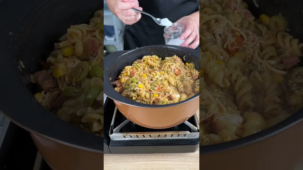 hoje nós vamos fazer um almoço em menos de 30 minutos em uma única panela e uma calabresa picada bacon cebola picada também botar para fritar né um pimentão vermelho picadinho três dentes de alho um tomate picado sem semente e vamos mexer 300 g de frango pimenta do reino um pouquinho de açafrão e uma latinha de milho verde Cheiro Verde a gosto um copo de de azeitona ó agora aqui vamos mexer um sachê de molho de tomate 350 g de macarrão que a água até cobrir ó mexer aqui ó cozinhar por 15 minutinhos pouco de sal