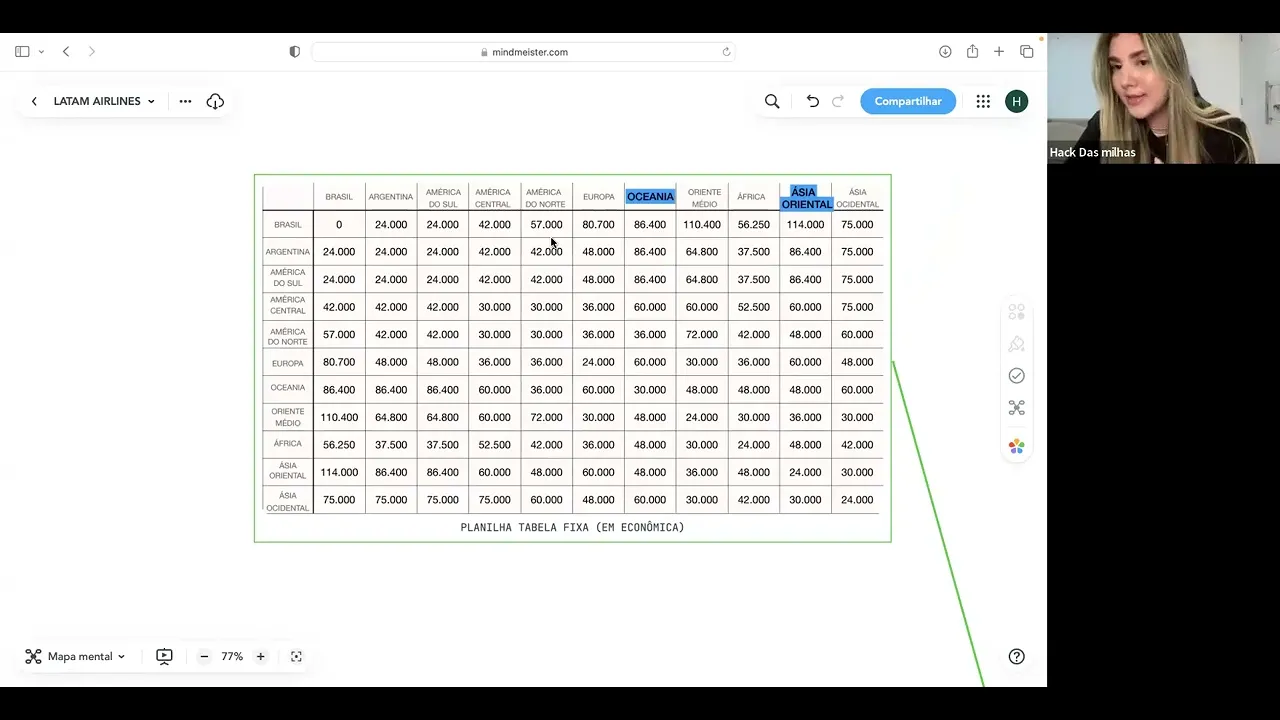 Oi eu sou a Evanise e essa é a parte dois da tabela fixa da latan vou voltar aqui só pro meu material Prontinho vamos lá existe tanto a tabela fixa quanto a tabela de regiões essas tabelas São Regras do programa dos programas de fidelidade e cada tabela tem a sua questão geográfica como que funciona essa tabela de regiões esse material aqui E esse texto aqui eu trouxe do site do próprio site da latan e eu vou ler para vocês rapidinho então vamos lá a quantidade de pontos necessários dependerá da cabine escolhida como eu falei na outra aula são quatro classes a Economy Premium Economy business e First Class e as quadro T valores distintos uma das outras e nas mudanças de região geográfica da Rota Ou seja a tabela fixa é baseada em regiões continuando lendo aqui rapidinho a pontuação será calculada levando em consideração cada região da sua viagem até o destino final não é baseado no número total de conexões que você realizar dentro de uma mesma região geográfica o que ele quer dizer com isso dentro de uma mesma região você não vai pagar não será cobrada essas conexões agora se você modifica a região Aí sim vai ser cobrado ou seja hipoteticamente se você faz uma viagem de uma região a para uma região B sem nenhuma escala a cobrança será baseado nessas duas regiões que é a a e a b da a para B Agora se a viagem for da região a pra região B passando por uma região C que seria a suposta conexão a cobrança será baseada nessas três regiões nas regiões totais trouxe um exemplo e que também estava no site da latan que é Rio para planta não é o exemplo prático da aula mas eu deixei aqui para vocês darem uma olhada com as minhas explicações o exemplo prático da aula vai ser São Paulo para Joanesburgo Então vamos supor nós estamos indo agora para a África do Sul com a catar muito bom então o que que a gente faz nós estamos em São Paulo e de São Paulo a gente vai para Dorra no catar Oriente Médio e do oriente médio a gente vai paraa África do Sul em Joanesburgo vou pegar aqui a planilha para ser melhor a visualização de vocês pronto estamos no Brasil como eu falei do Brasil a gente vai pro Oriente Médio que é no Qatar a viagem termina no Qatar Não não é nosso destino final então o que que acontece como você vai saber calcular a quantidade de milhas na tabela fixa da onde você vai da onde você está a sua origem até o seu destino final se tiver uma conexão você vai ter que contar essa conexão também então vamos lá do Brasil para Oriente Médio são 110. 400 pontos o Oriente méd nosso destino final não então vamos lá segura esses 10 1400 pontos do Oriente Médio a gente vai para África África mais 30. 000 pontos ou seja vai ter que somar todo o percurso Brasil Oriente Médio Oriente Médio África ou seja 110.