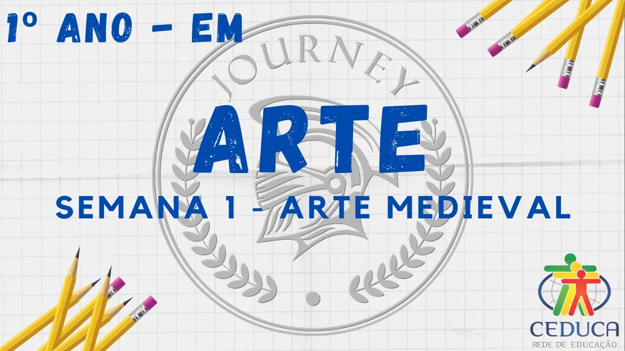 e aí e aí o olá pessoal primeiro ano todos nós vamos começar o nosso conteúdo de segundo bimestre no primeiro bimestre a gente falou sobre as linguagens artísticas de uma forma isolada dança teatro música e artes visuais artes visuais na verdade a gente começou mais a trabalhar com a gente começou a linha histórica do da arte rupestre tudo mais que a gente falou na última aula arte romana arte grega e pra e vai hoje nós vamos falar sobre arte medieval período medieval na arte foi um período assim um tanto quanto curioso pois várias coisas aconteceram