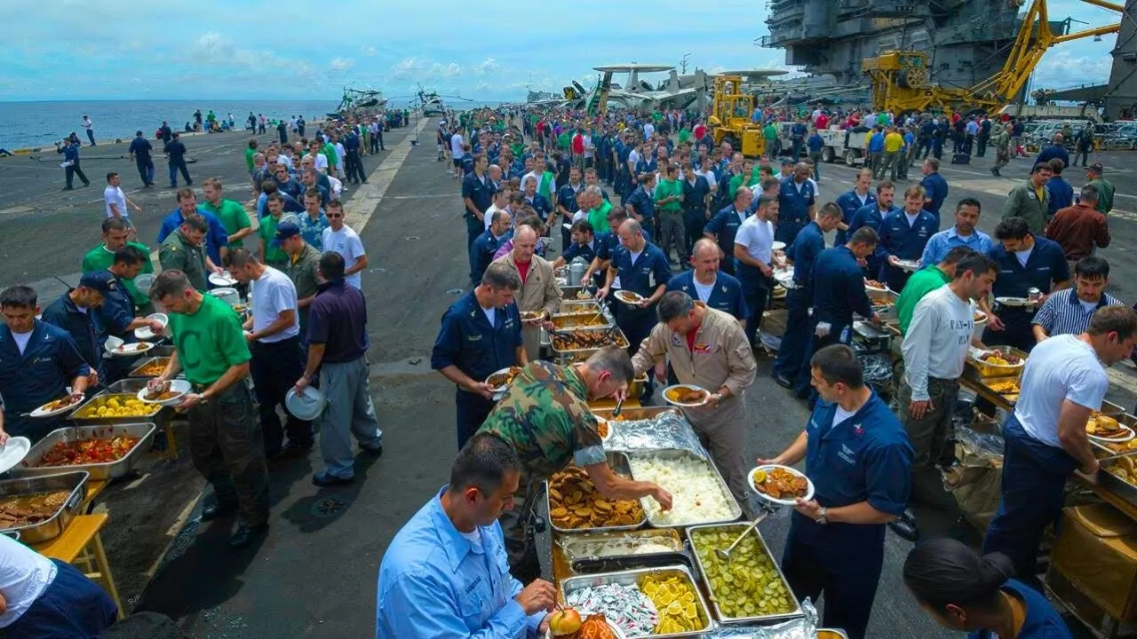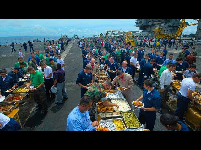 all the things they have to think through in in order to prepare a perfect meal for the occasion while this part simply outstanding transforming the mighty aircraft carrier Flight Deck into a temporary Festival ground takes meticulous planning and nowhere is this more evident than in the culinary orchestration happening below decks here within the confines of the bustling Galley a dedicated team prepares to feed thousands of hungry Sailors a far cry from your typical Backyard Barbecue weeks before the pick Tech the supply Department Works hand inhand with the morale welfare and Recreation committee meticulously planning the