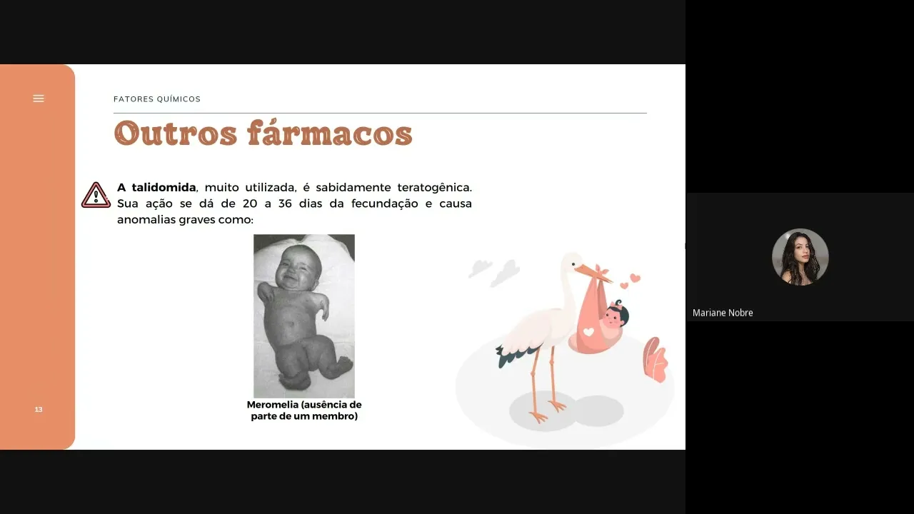 que a talida causa anomalias congênitas foi de 20 a 36 dias após a fecundação esse período sensível coincide com os períodos críticos para o desenvolvimento das partes e órgãos afetados agora eu vou passar a palavra para Sara em relação às drogas não há evidências de que a maconha seja um teratose no humano no entanto alguns estudos vão indicar que seu uso durante os dois primeiros meses de gravidez vão afetar o crescimento do feto e também o peso dele ao nascer a cocaína é uma droga ilícita muito comum usar entre as mulheres em período fértil e