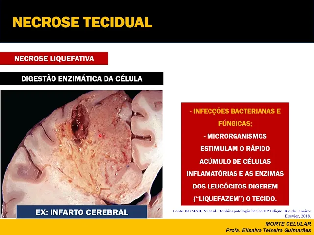 micro-organismos eles estimulam rápido acúmulo de células inflamatórias e as enzimas esses leucócitos dessas células inflamatórias elas digerem elas limpa e fazem uma tecido quer dizer transformam no tecido e uma massa viscosa e quando isso está associado a uma infecção bacteriana é o que nós chamamos comumente depois então aqui por exemplo olha não atende nós temos uma macroscopia de um o cerebral porque o cérebro apesar de seu nome sólido ele geralmente não faz o motivos ainda razões é não compreendidas ele não faz uma necrose coagulativa como nós falamos slide anterior ele faz uma necrose liquefativa quando