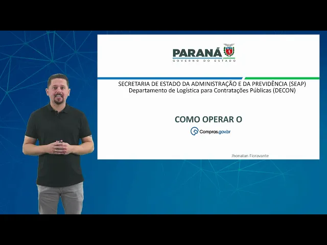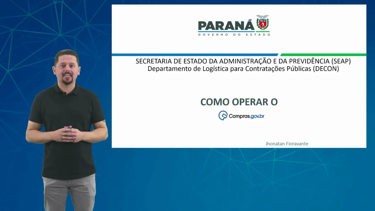 Olá pessoal tudo bem Meu nome é Jonathan atualmente Eu trabalho aqui na secretaria de administração e da Previdência né Mais especificamente no decom né Eu atuo como chefe de divisão e pregoeiro agente de contratação há aproximadamente 4 anos ok Hoje a gente vai eh tratar aqui de como né a gente vai conduzir nossas licitações pelo sistema compras goov Ok sistema utilizado aí pela pelo poder executivo né nas licitações nos moldes da nova lei de licitações né sistema que foi escolhido pela secretaria de administração e de previdência né Eh considerando sua competência né através do artigo