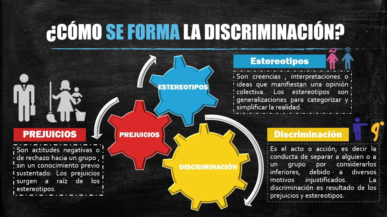 y prejuicios del género surgirá la discriminación por género si tenemos estereotipos étnicos raciales tendremos discriminación racial y así con la orientación sexual edad religión aspecto físico condición económica etcétera podemos concluir que si deseamos un país libre de discriminación tenemos que atacar los estereotipos negativos desde las familias escuelas medios de comunicación instituciones públicas y gobierno muy bien esto ha sido todo por hoy hasta un próximo vídeo
