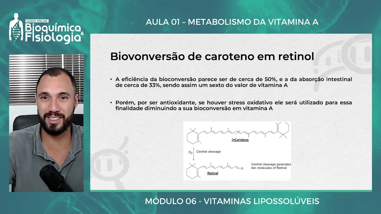 Olá tudo bem seja muito bem-vindo aqui a mais uma aula dando continuidade né ao metabolismo dos nutrientes nessa aula nós vamos falar sobre metabolismo da vitamina A vamos dar início ao estudo das vitaminas lipossolúveis né Elas recebem esse nome lipossolúveis né Essa classificação na verdade pela sua solubilidade em lipídios pelo seu caráter hidrofóbico certo pelo seu caráter poar a gente vai perceber que a sua estrutura química é bem similar aos lipídios inclusive elas podem ser ligadas a essas moléculas algumas moléculas lipídicas Tá certo primeiro o que que é Vitamina A né a vitamina A ela