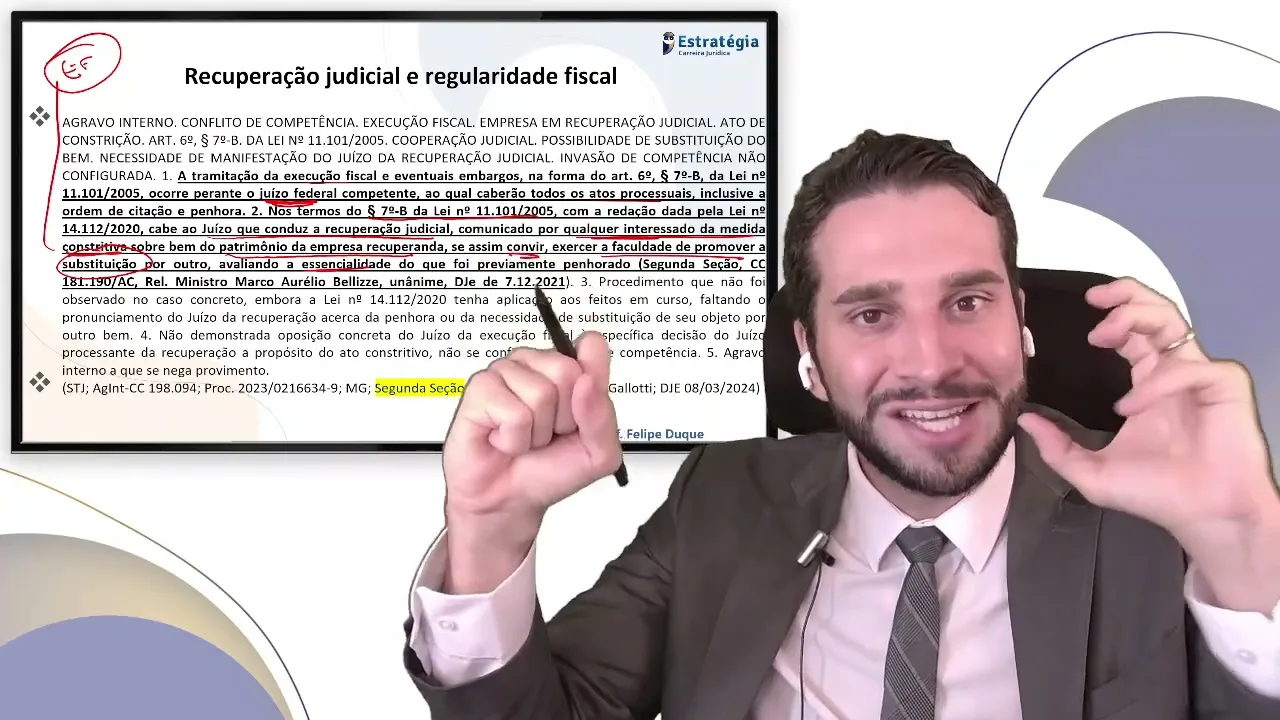 lei ainda insuficiente para mim ou seja ela é insuficiente para dizer que você vai ter que aar citação Professor V evoluir E depois eu vou retomando entendimento recente do STJ que a gente tem primeiro o deferimento da recuperação judicial não suspende as execuções fiscais a gente já sabe disso né a gente não pode misturar uma coisa com outra só que é cabível ao juiz Universal analisar a viabilidade de constrição patrimonial em cada caso concreto respeitada a regra do artigo 69 podendo constatar de inviabilidade e determinar a eventual substituição na medida para preservar o plano de