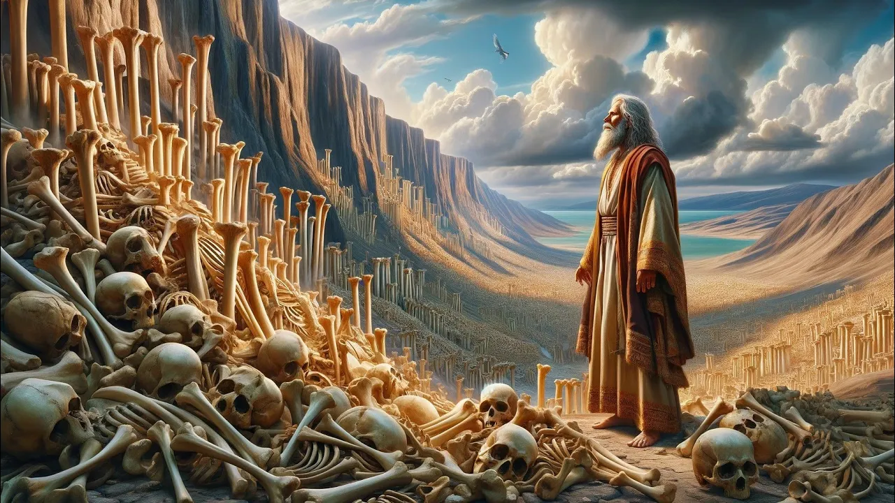 dos Ossos Secos É principalmente sobre os filhos de is mas também tem implicações práticas para nossas próprias vidas Ezequiel Capítulo 37 Versículos 1 e do a mão do senhor veio sobre mim e me levou no espírito do senhor e me colocou no meio do Vale e ele estava cheio de ossos Então ele me fez passar por todos eles ao redor e Eis que havia muitos no Vale aberto e na verdade eles estavam muito secos o senhor apareceu a Ezequiel na forma de um vale cheio de ossos secos Deus não muda a localização de Ezequiel Mas