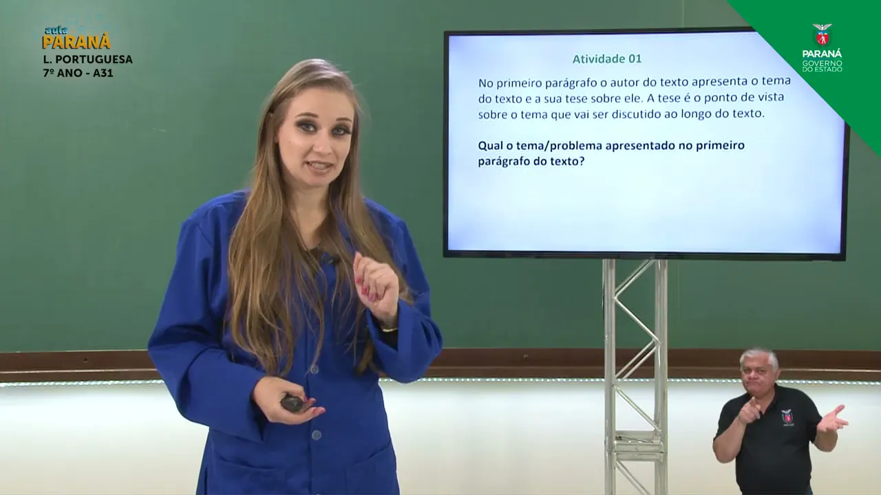 autor do texto apresenta apresenta o tema do texto e sua tese sobre ele a tese é o ponto de vista sobre o tema que vai ser discutido ao longo do texto qual o tema né problema apresentado no primeiro parágrafo do texto então vocês vão retornar lá no primeiro parágrafo que a gente acabou de ler e vocês vão encontrar qual o tema né versus tese o tema o problema é apresentado no primeiro parágrafo eu vou dar um tempo para você se esconder esta atividade e eu logo volto para fazermos a correção [Música] E aí [Música] E