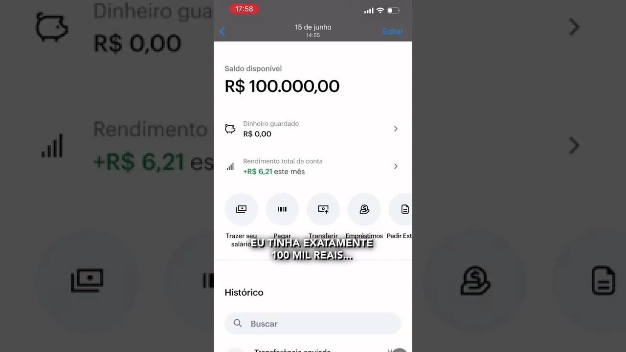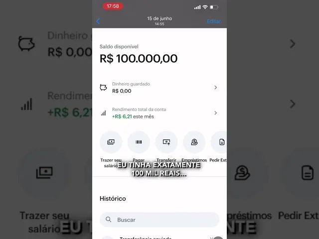 e eu testei deixar 100 mil raiz parados para conta tudo bem que durante 30 dias para ver o que aconteceria a nuconta rende tem por cento do CDI que hoje está em 13,15 por cento ao ano dividindo ao mês eu tenho rendimento bruto de 1,095 por cento descontando o imposto de renda de 22,5 por cento eu teria de forma líquida o rendimento de 0,84 nove porcento ao mês ou seja sempre esse teriam que me render 849 e vamos ver se foi isso que aconteceu aqui no dia 15/11 podem ver no print eu tinha exatamente 100