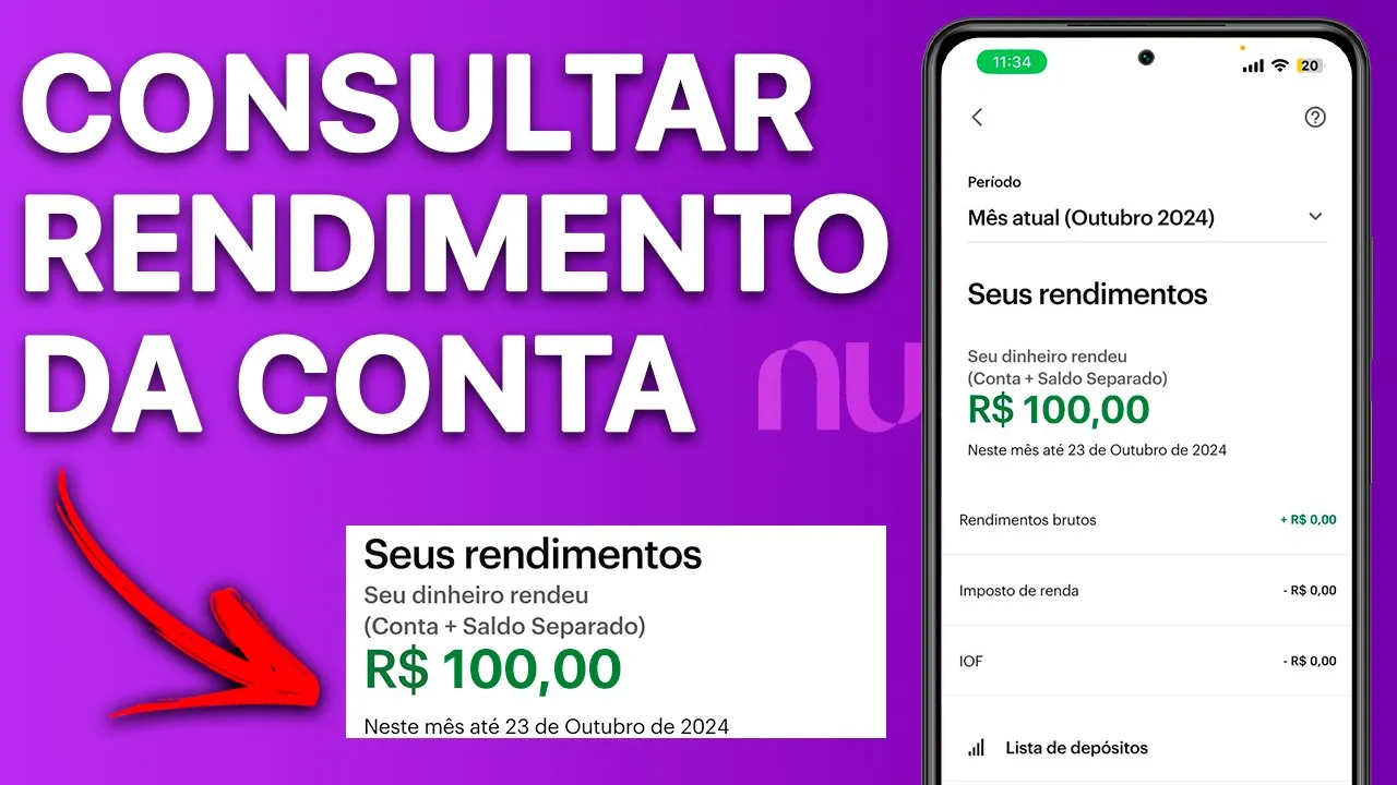 Neste vídeo eu vou te mostrar aqui no aplicativo do nubank como você visualizar esta telinha de rendimentos da sua conta porque você tava acostumado a visualizar essa tela de investimentos o rendimento do saldo da sua conta em um local porém ele mudou e não ficou muito intuitivo para os usuários então o objetivo desse vídeo é te mostrar aonde você encontra novamente essa opção de analisar quanto o dinheiro que tá guardado na sua conta no saldo separado e também disponível na sua conta vendeu em cada mês que é um rendimento que fica separado e diferente dos