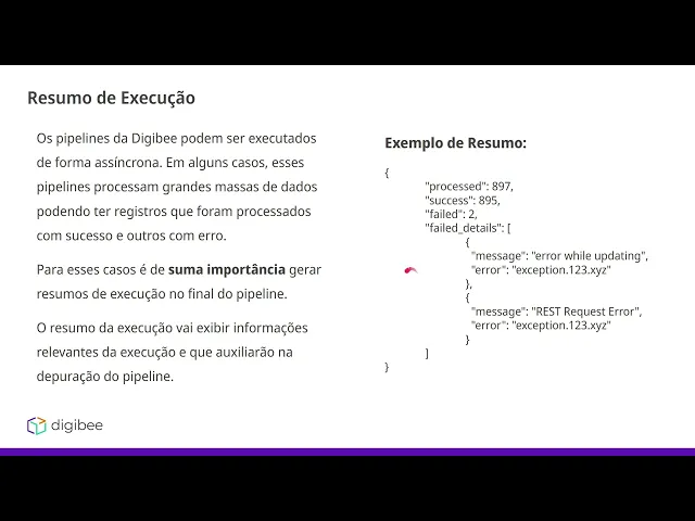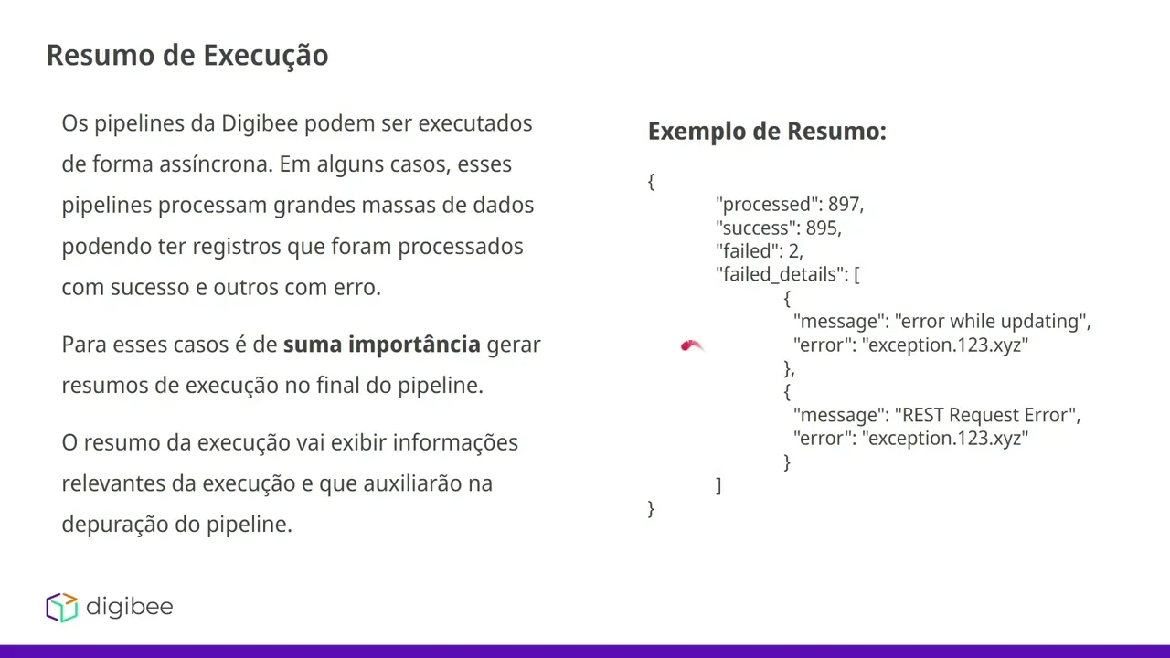 Olá esse é o integration developer bootcamp estamos na etapa de boas práticas de desenvolvimento nesse vídeo falaremos sobre resumos de execução os pipelines da DB podem ser executados de forma assíncrona em alguns casos esses pipelines processam grandes massas de dados podendo ter registros que foram processados com sucesso e outros com erros para esses casos é de suma importância gerar resumos de execução no final do pipeline o resumo da execução vai exibir informações relevantes da execução e que auxiliarão na depuração do pipeline aqui à direita temos um exemplo de resumo temos os quantidade de dados processados