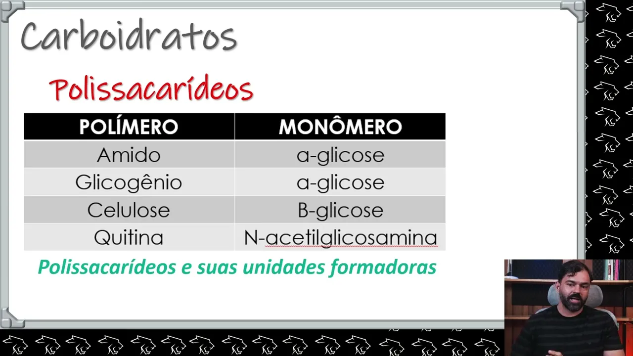 Fala galera ligada na prova e Professor Pedro de volta dando continuidade ao estudo da bioquímica celular vamos entrar nessa aula número dois do assunto onde iremos abordar mais dois grupos de compostos orgânicos sendo eles os carboidratos e os lipídeos começando a falar dos carboidratos temos que ter em mente antes de mais nada que são compostos orgânicos obviamente formados principalmente por carbono hidrogênio e oxigênio existem carboidratos com outros elementos na composição como por exemplo nitrogênio enfim mas principalmente um carboidrato é formado por carbono hidrogênio e oxigênio os carboidratos possuem outros nomes como a AES hidratos de