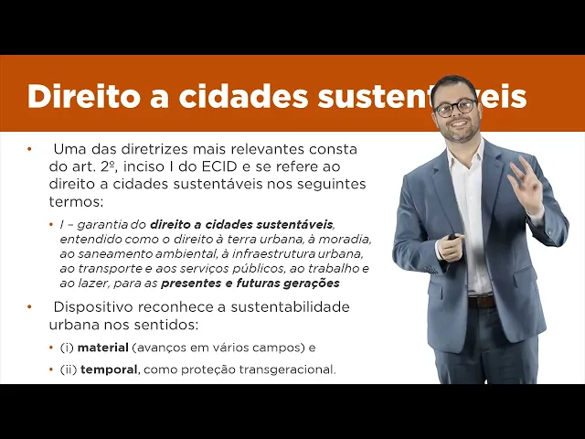 tem uma deficiência assim por diante Tá bom então esse é o rol resumido das importantíssimas diretrizes de desenvolvimento urbano que se aplicam a todos os municípios todos os estados e a própria União aqui no nosso ordenamento jurídico Bom eu comentarei agora rapidamente alguns temas que o artigo segundo menciona começando pela pela diretriz as cidades sustentáveis ou seja pelo direito à cidade sustentáveis na verdade Pessoal esse é um dos temas mais importantes que nós temos aqui no estatuto da cidade tanto que essa diretriz aparece lá no artigo 2º inciso 1º então diz assim siso que é