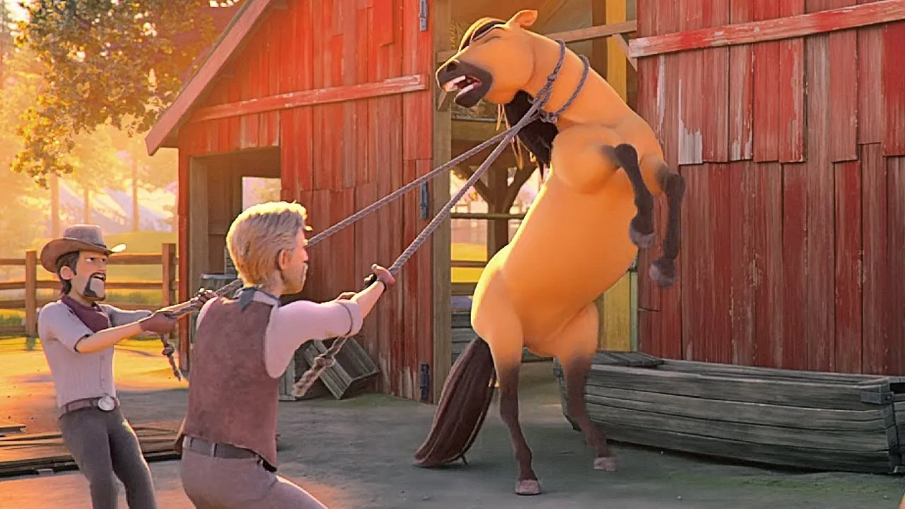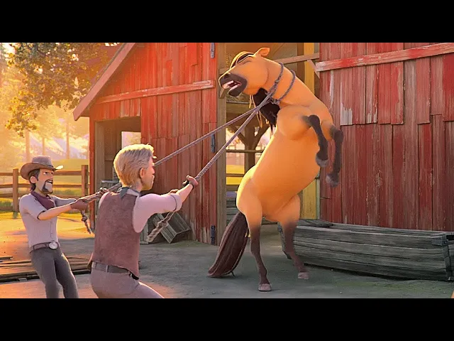 horses raise their heads in Fright as they realize the Cowboys are approaching and start lassoing them one by one immediately spirit is on the front line trying to protect his family and lucky is worried about her friend in this moment of distraction the young woman ends up falling when the train arrives on the scene within minutes the animals are dragged into a wagon and the Wild Horse appears knocking down all the henchmen at once the young Prescott tries to defend the equines but ends up receiving a blow from Hendrix who is attacked by Spirit nevertheless